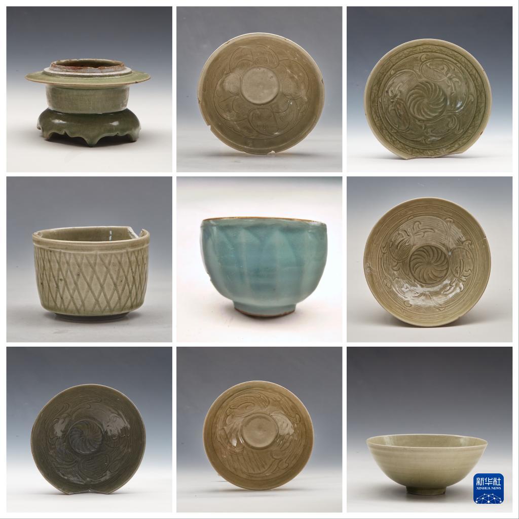 浙江溫州朔門(mén)古港遺址發(fā)掘出的龍泉窯瓷器(拼版資料照片)。