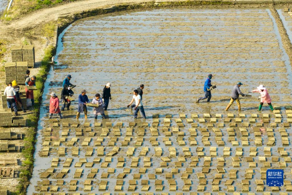 3月28日,在浙江省余姚市黃家埠鎮上塘村,農民在稻田里擺放早稻機插秧盤(pán)(無(wú)人機照片)。