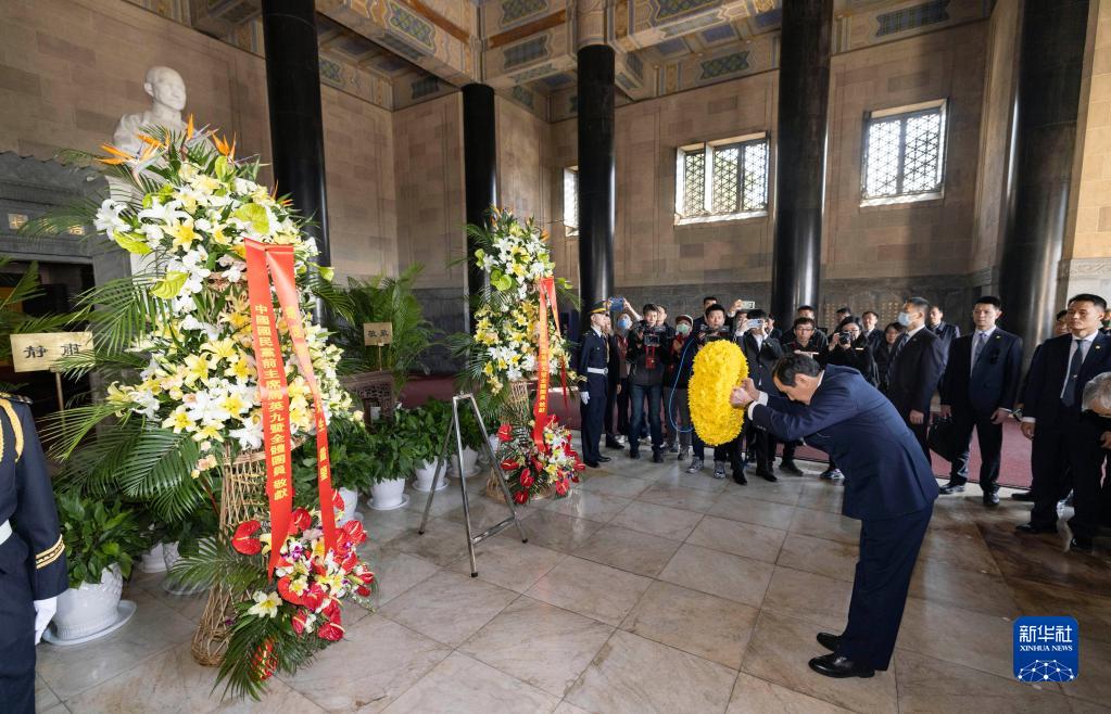 3月28日上午,中國國民黨前主席馬英九一行拜謁南京中山陵。這是在中山陵祭堂,馬英九向孫中山坐像敬獻花環(huán)。