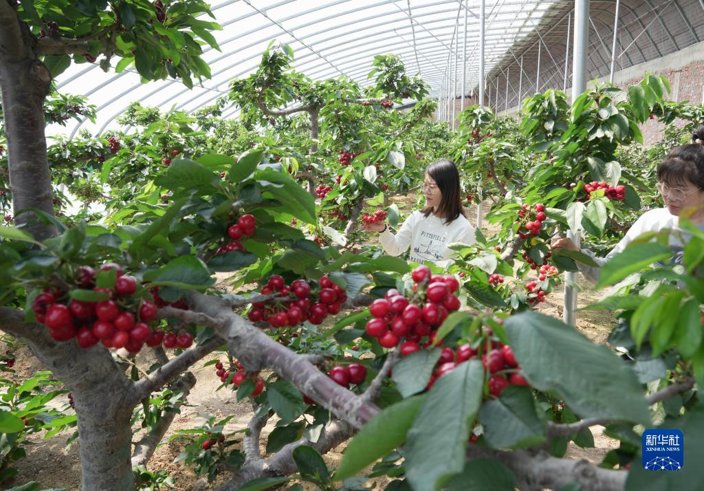 3月28日,游客在秦皇島市海港區海陽(yáng)鎮常香苑家庭農場(chǎng)的大棚內采摘櫻桃。