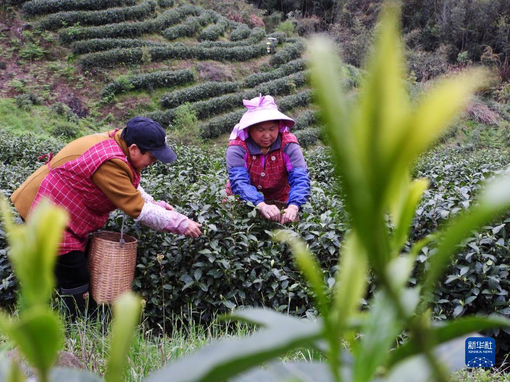 3月28日,四川省達州市大竹縣團壩鎮白茶村巴山青白茶種植基地,茶農在采摘明前茶。