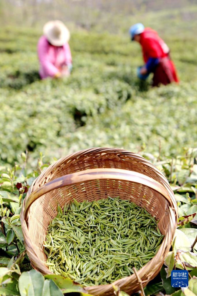 3月28日,在湖北省十堰市鄖陽(yáng)區譚家灣鎮五道嶺村,茶農忙著(zhù)采摘茶葉。