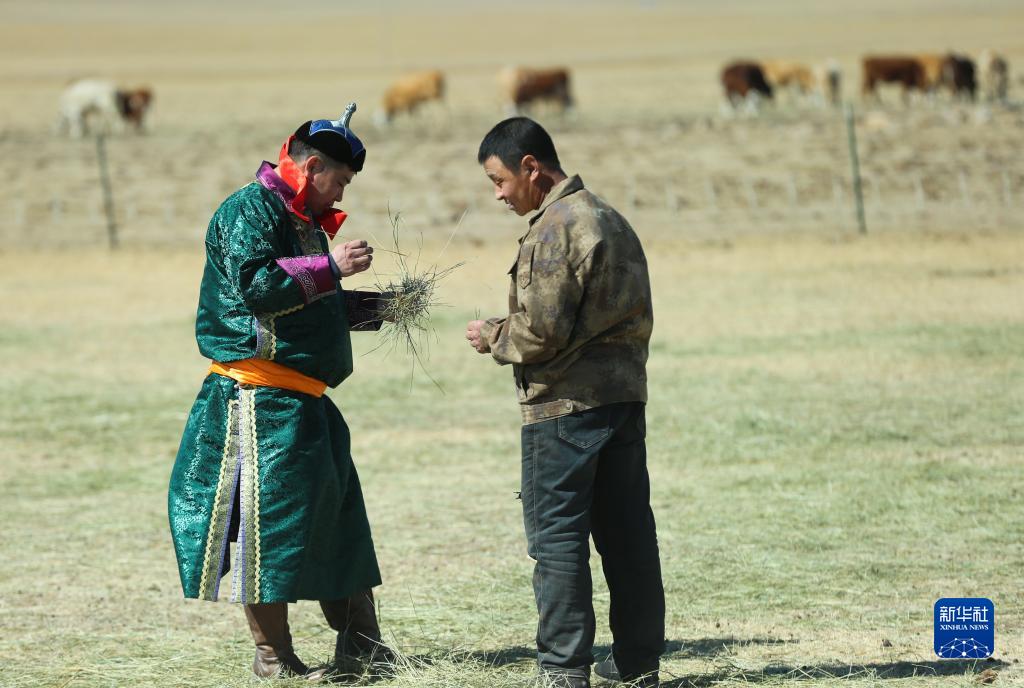 3月28日,在巴彥額日和圖嘎查一戶(hù)牧民的草場(chǎng)上,一名嘎查黨員與牧民交流。