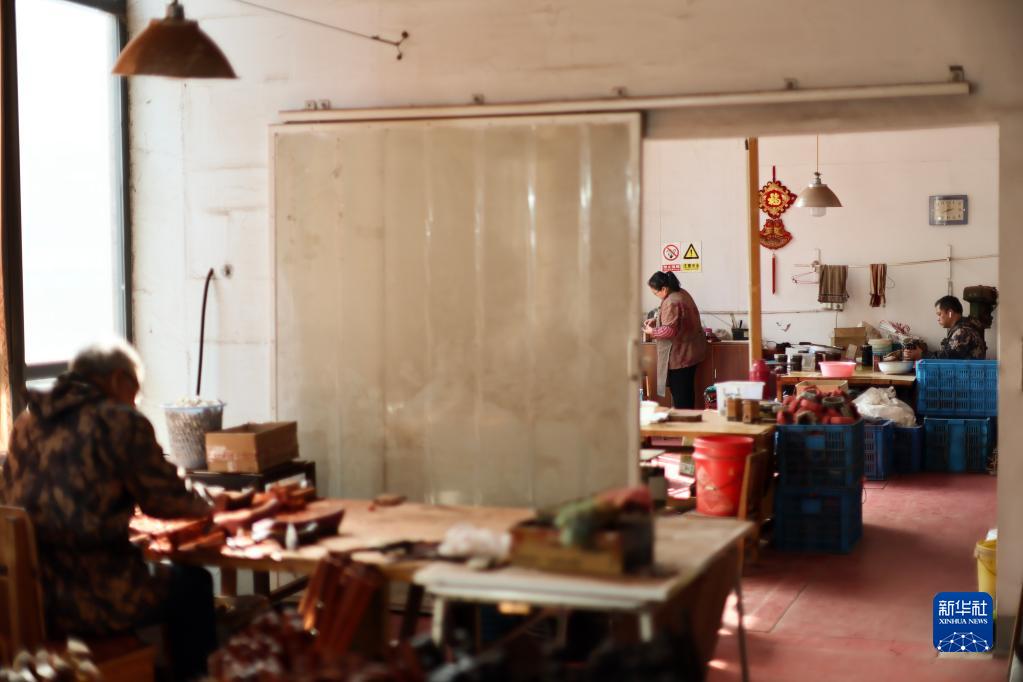 3月28日,在江蘇無(wú)錫梅村街道二胡產(chǎn)業(yè)園,工人在制作二胡。