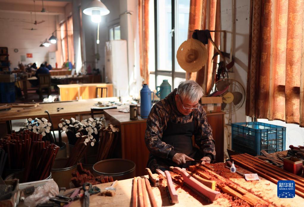 3月28日,在江蘇無(wú)錫梅村街道二胡產(chǎn)業(yè)園,工人在制作琴桿。