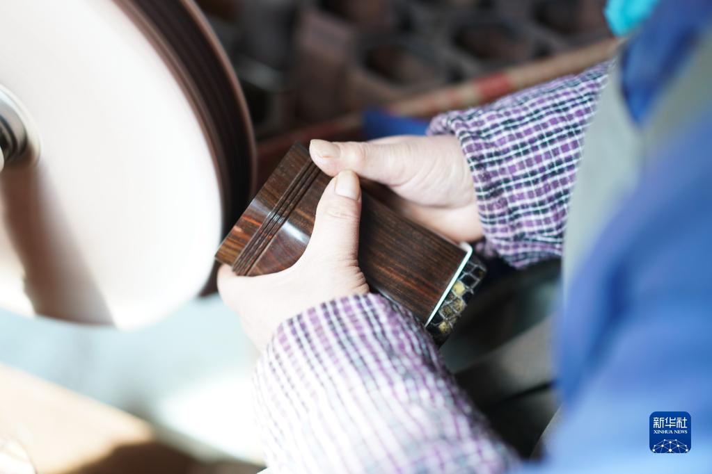 3月28日,在江蘇無(wú)錫梅村街道二胡產(chǎn)業(yè)園古月琴坊車(chē)間,工人在對琴筒進(jìn)行拋光。