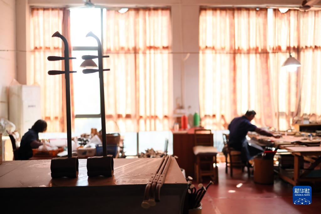 3月28日,在江蘇無(wú)錫梅村街道二胡產(chǎn)業(yè)園,工人在制作二胡。