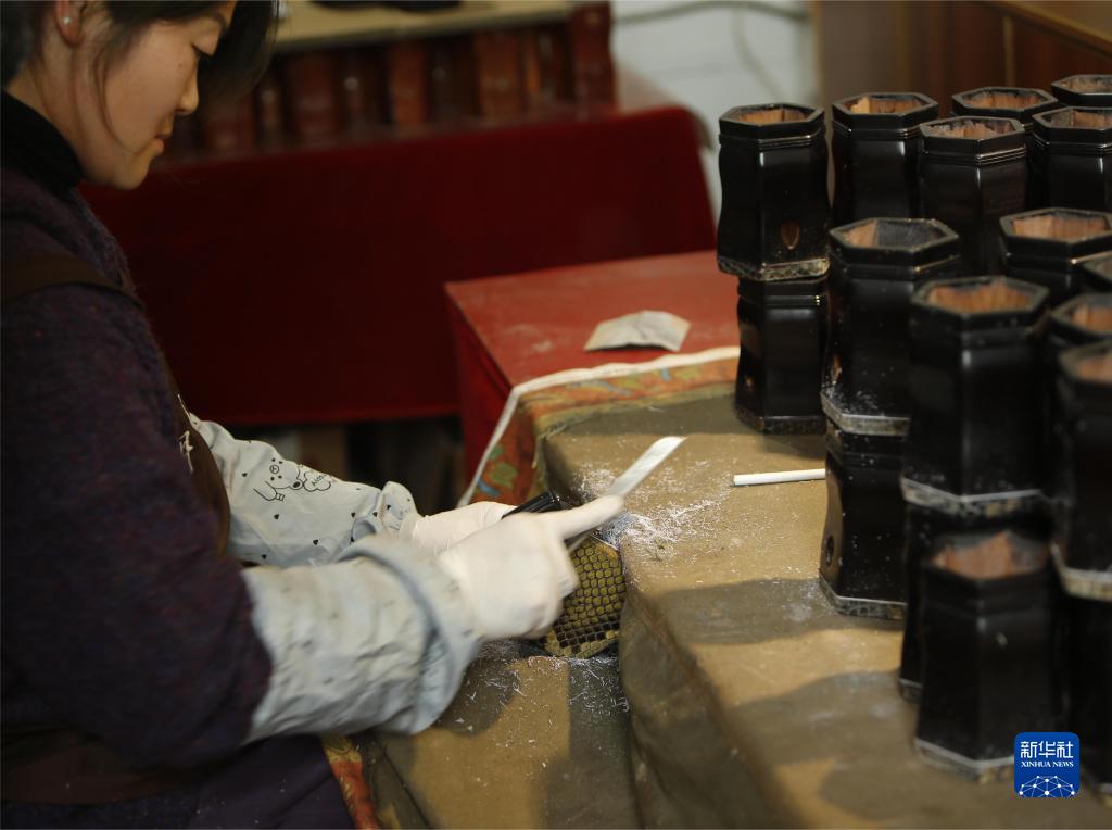 3月28日,工人在江蘇無(wú)錫梅村街道二胡產(chǎn)業(yè)園古月琴坊打磨二胡琴筒。