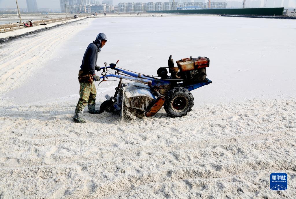 3月28日,在江蘇省連云港市大浦鹽田,工人操作機械在鹽田里進(jìn)行破碴作業(yè)。