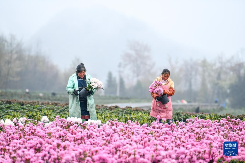 3月28日,農民在貴州省畢節市百里杜鵑管理區匯境花卉基地搬運花卉。