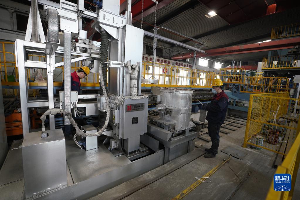 3月29日,在滄州渤海新區黃驊市榮泰模具科技股份有限公司生產(chǎn)車(chē)間,工人調試全自動(dòng)智能鑄造生產(chǎn)線(xiàn)。