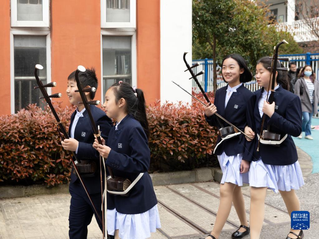 3月29日,江蘇無(wú)錫梅村實(shí)驗小學(xué)學(xué)生準備去上二胡課。