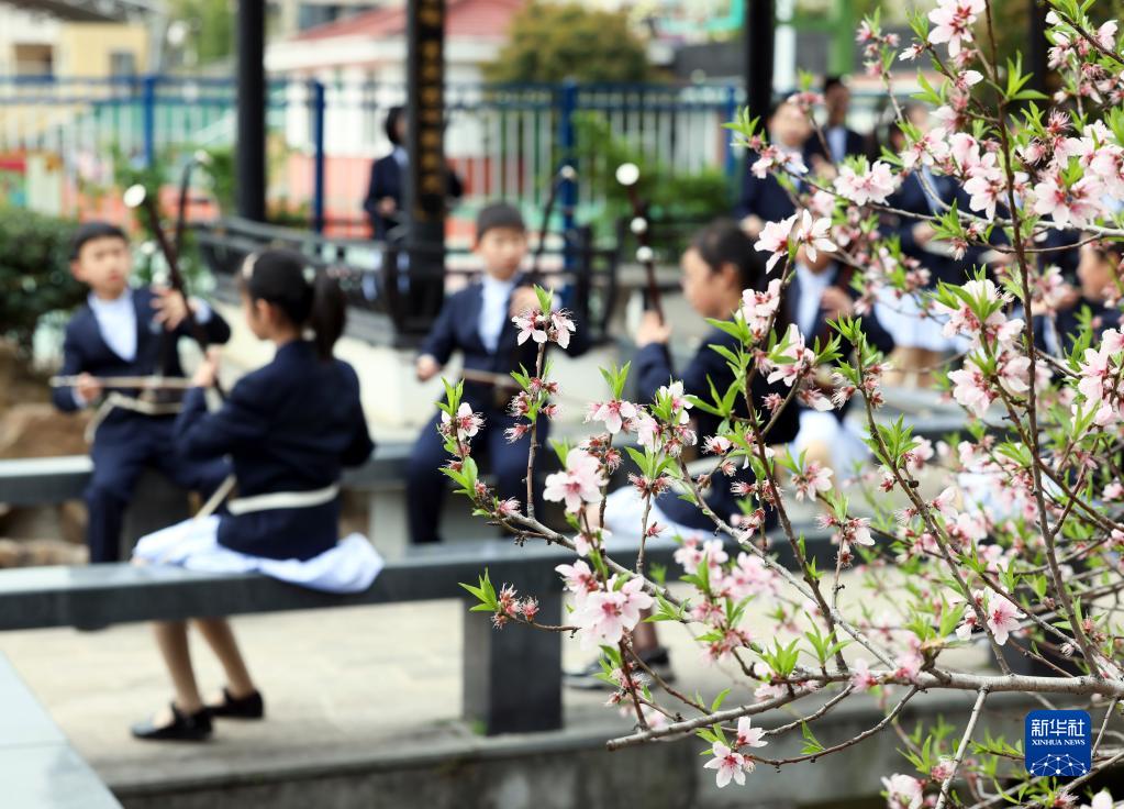 3月29日,江蘇無(wú)錫梅村實(shí)驗小學(xué)二胡社團學(xué)生在戶(hù)外演奏。
