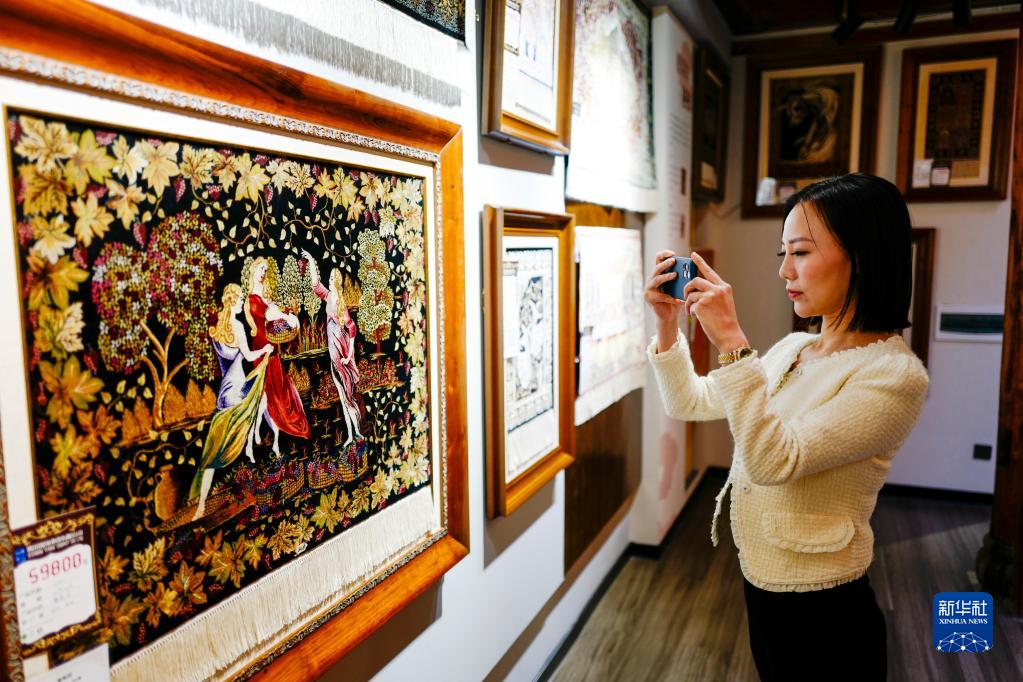 3月21日,游客在銀河絲坊觀(guān)賞出口海外的絲毯產(chǎn)品。