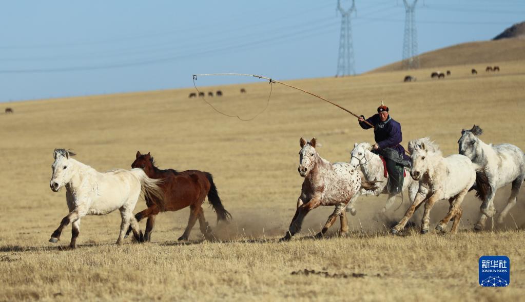 春日到來(lái),內蒙古錫林郭勒盟西烏珠穆沁旗天氣轉暖,當地牧民趕著(zhù)馬匹,來(lái)到草原上馴馬。