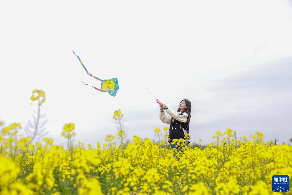 3月29日,游客在來(lái)安縣大英鎮一生態(tài)農莊內的油菜花海中放風(fēng)箏。