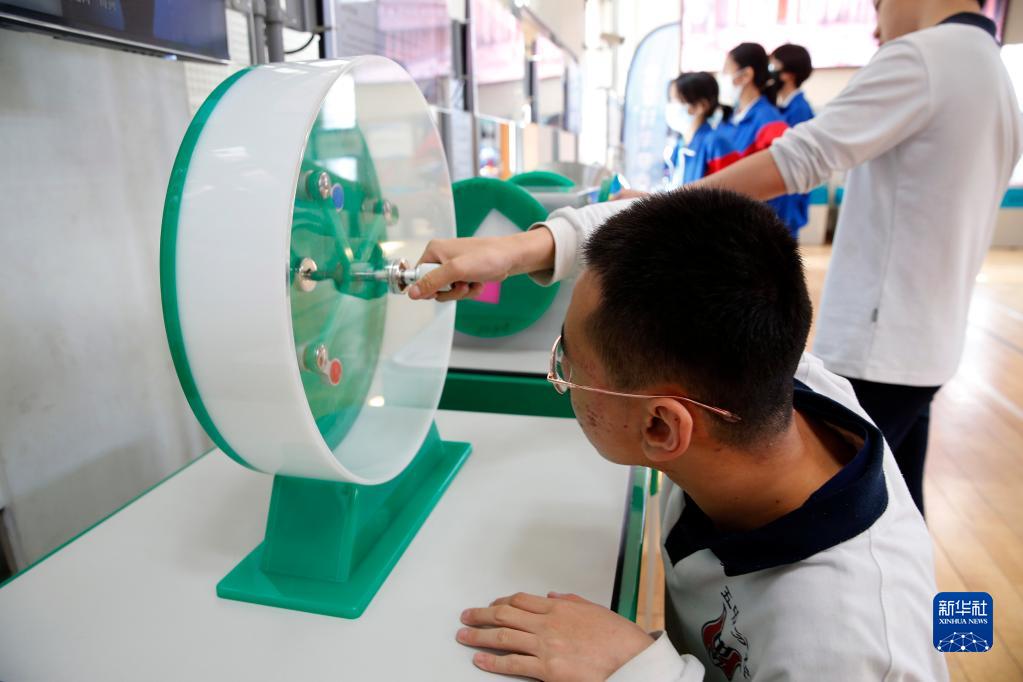 3月29日,中學(xué)生在校園流動(dòng)科普巡展中體驗趣味科學(xué)裝置。