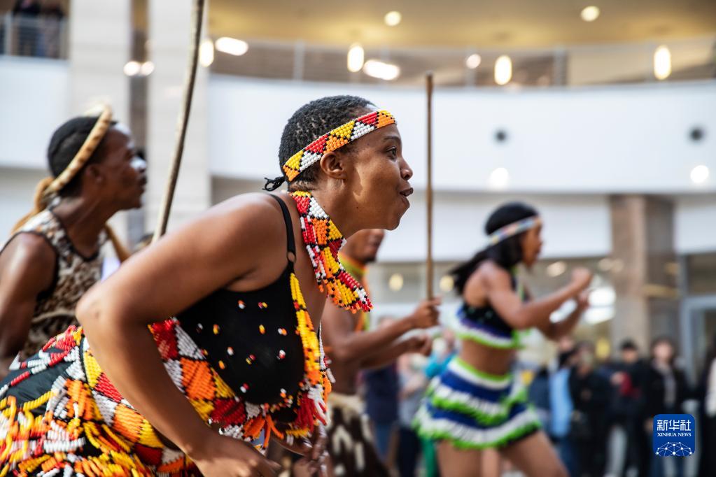 3月29日,在南非約翰內斯堡坦博國際機場(chǎng),舞蹈演員在歡迎中國游客的儀式上表演。