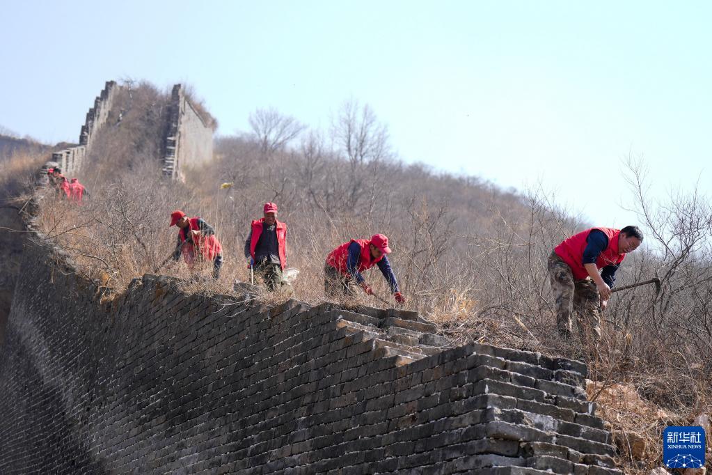 3月29日,“洪山口長(cháng)城保護小分隊”隊員在長(cháng)城上清理樹(shù)枝。