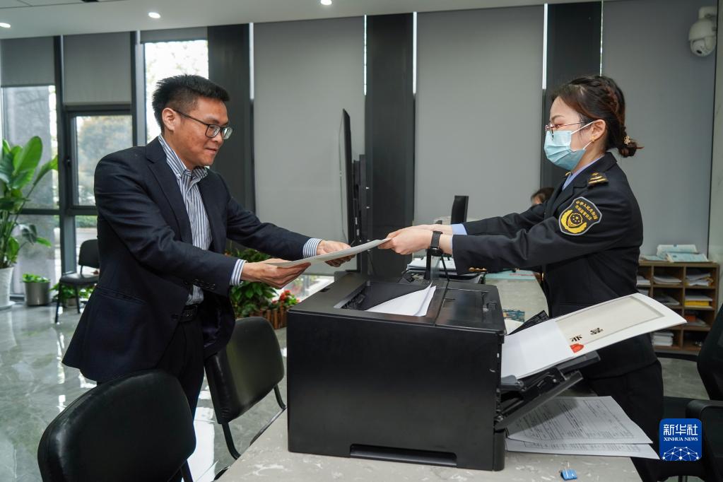 3月30日,在南京市雨花臺區市場(chǎng)監管局雨花分局,江蘇省第1000萬(wàn)戶(hù)個(gè)體工商戶(hù)張康(左)領(lǐng)取個(gè)體工商戶(hù)營(yíng)業(yè)執照。