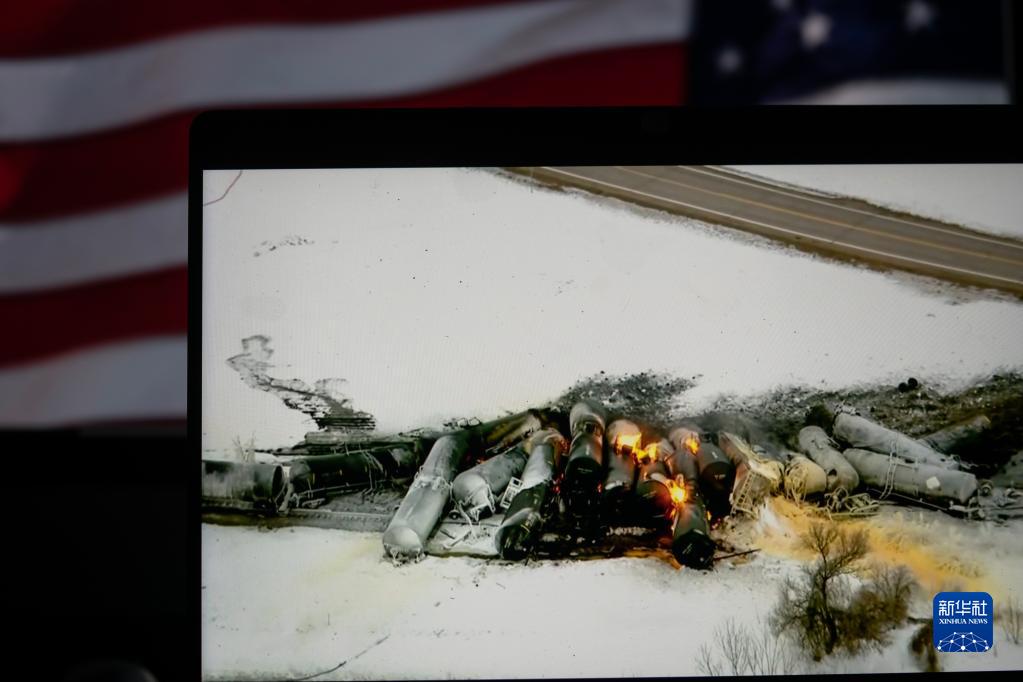 3月30日在美國阿靈頓拍攝的屏幕顯示美國明尼蘇達州貨運列車(chē)脫軌事故現場(chǎng)畫(huà)面。