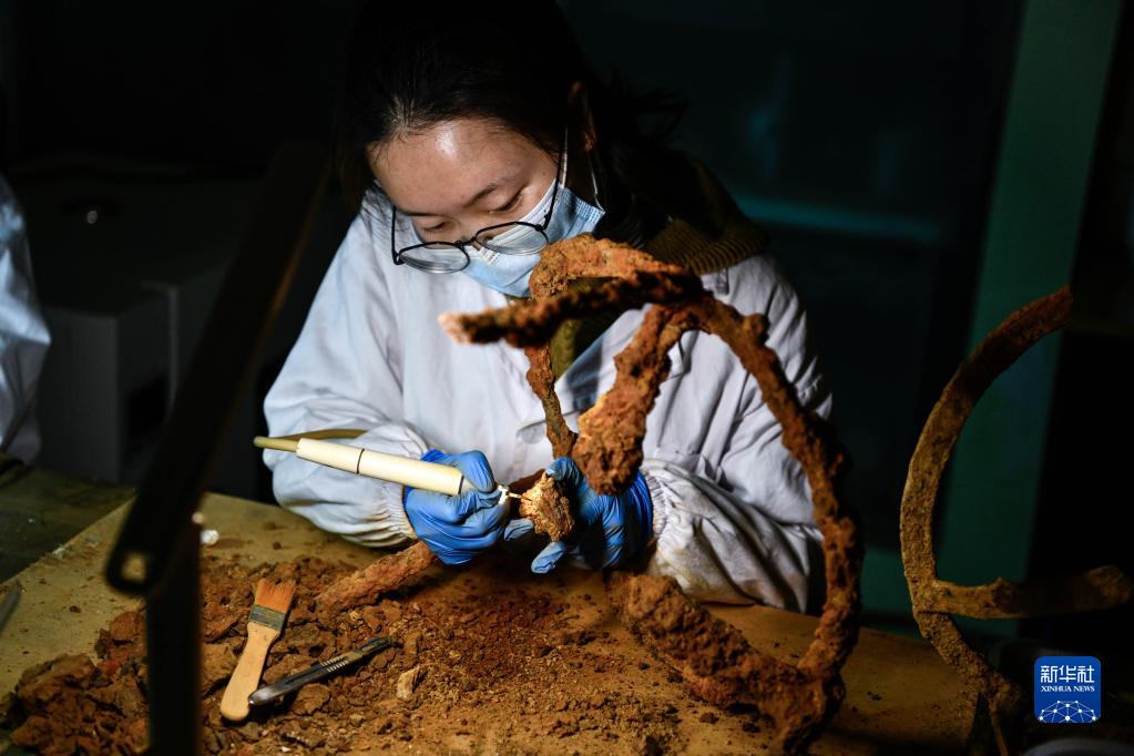 3月30日,在貴州貴安新區大松山墓群文物臨時(shí)庫房,文物保護專(zhuān)業(yè)的學(xué)生在清理出土的鐵器類(lèi)文物。