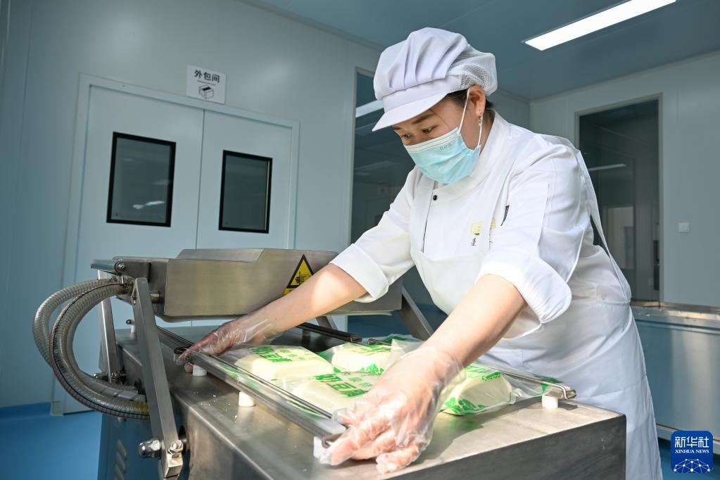 3月31日,在鑲黃旗民族傳統奶制品產(chǎn)業(yè)園的一家奶制品企業(yè)生產(chǎn)車(chē)間,工作人員包裝奶豆腐。