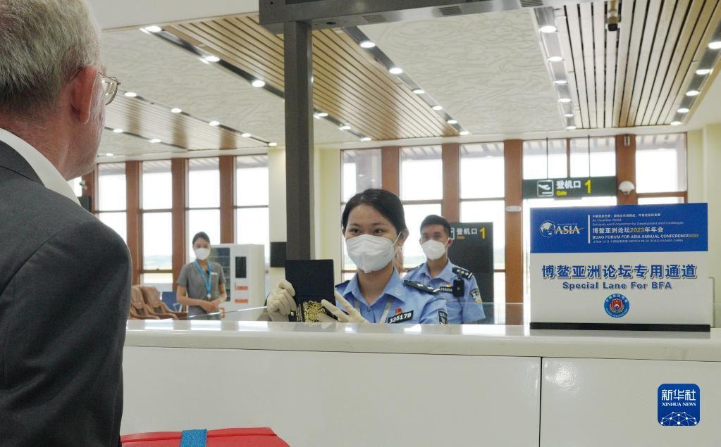 3月31日,在博鰲機場(chǎng),美蘭出入境邊防檢查站執勤民警在博鰲亞洲論壇專(zhuān)用通道為與會(huì )嘉賓提供通關(guān)服務(wù)。