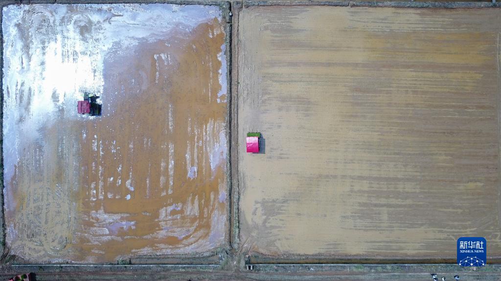 3月31日,在湖南省瀏陽(yáng)市龍伏鎮的雙季稻種植示范基地,農民駕駛拋秧機、插秧機進(jìn)行拋秧、插秧作業(yè)(無(wú)人機照片)。