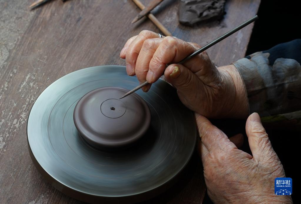 3月30日,在曹婉芬紫砂藝術(shù)館,曹婉芬在制壺。