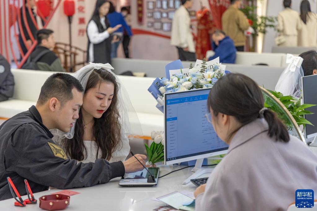 3月31日,一對新人在重慶市兩江新區婚姻登記處的窗口辦理婚姻登記。