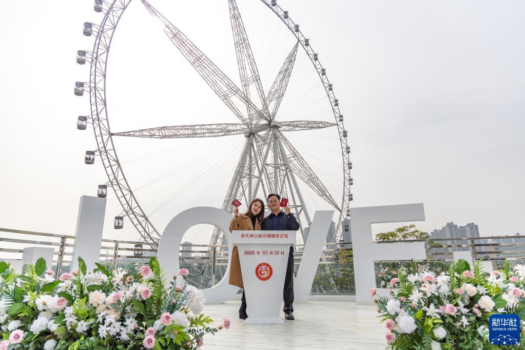 3月31日,在重慶市兩江新區婚姻登記處,一對新人領(lǐng)取結婚證后在歡樂(lè )谷“重慶之眼”摩天輪下拍照留影。