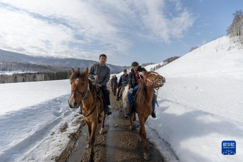 3月30日,蘇卡(前左)和馬隊成員騎馬上山。