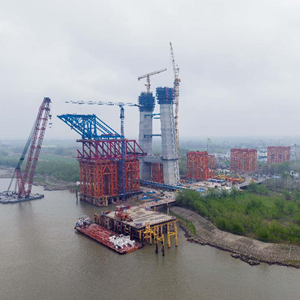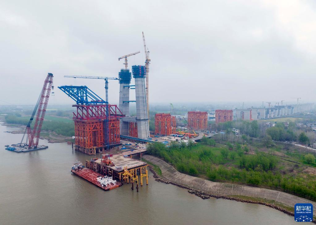 3月30日,中交二航局工人在安徽省馬鞍山長(cháng)江公鐵兩用大橋建設現場(chǎng)施工(無(wú)人機照片)。