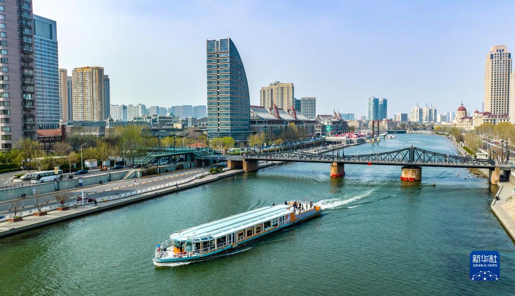 3月31日,一艘游船駛過(guò)天津海河上的金湯橋(無(wú)人機照片)。