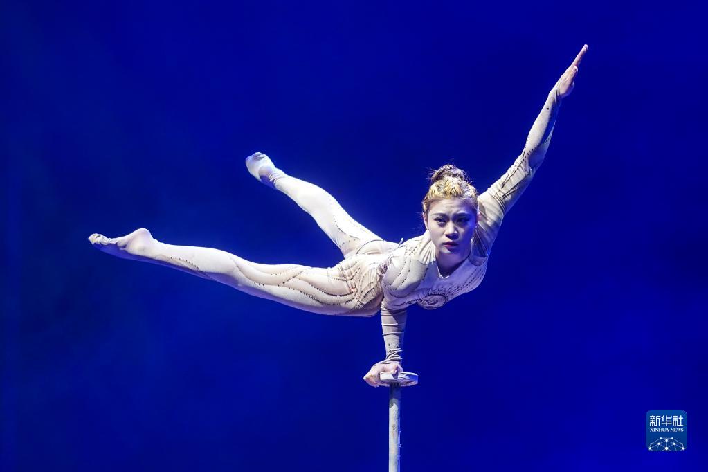 3月31日,在江蘇省鹽城市建湖縣,雜技演員王夢(mèng)塵在表演雜技節目《煉——倒立技巧》。