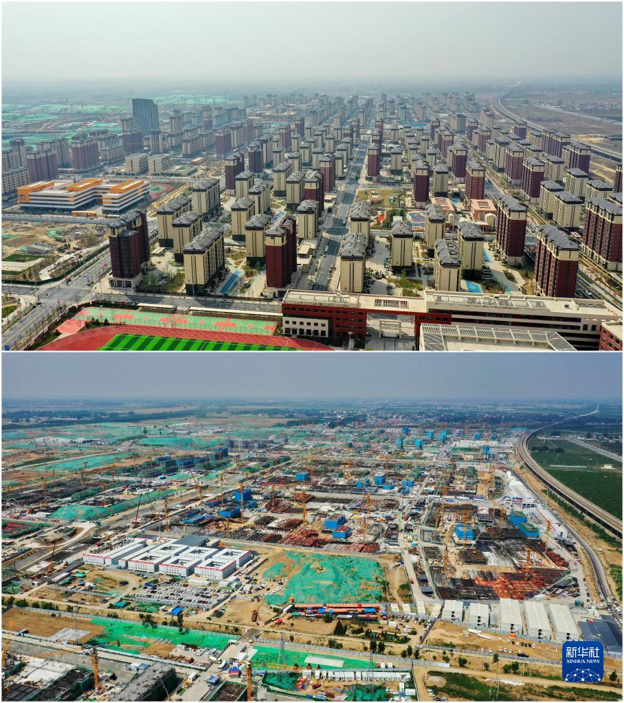 拼版照片:上圖為2023年3月31日拍攝的雄安新區容西片區(無(wú)人機照片);下圖為2021年7月3日拍攝的雄安新區容西片區建設現場(chǎng)(無(wú)人機照片)。