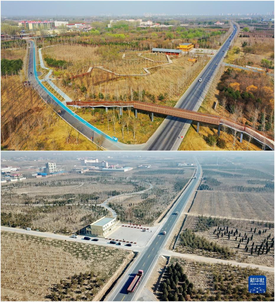 拼版照片:上圖為2023年3月30日拍攝的雄安新區千年秀林(無(wú)人機照片);下圖為2019年1月17日拍攝的雄安新區千年秀林(無(wú)人機照片)。