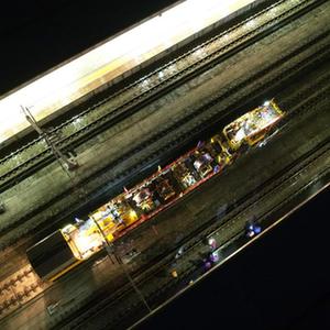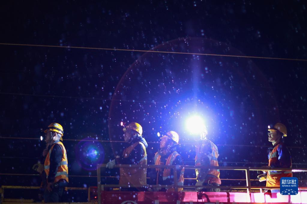 4月1日,工作人員乘坐架線(xiàn)車(chē)準備對接觸網(wǎng)導線(xiàn)進(jìn)行架設。