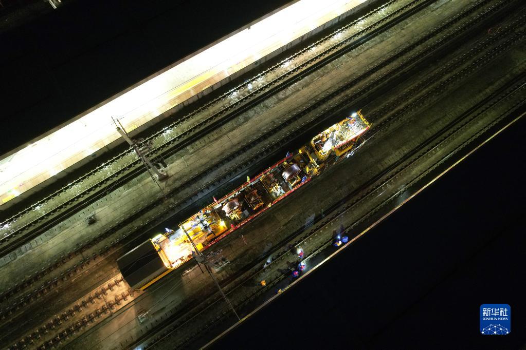 4月1日,工作人員乘坐架線(xiàn)車(chē)對接觸網(wǎng)導線(xiàn)進(jìn)行架設(無(wú)人機照片)。