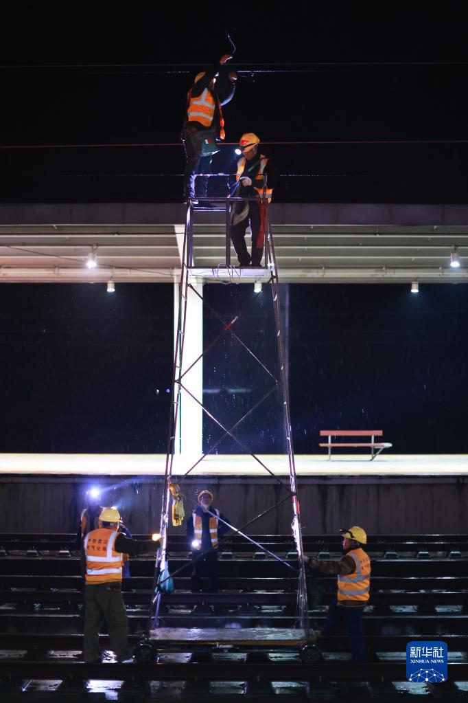 3月31日,工作人員在進(jìn)行接觸網(wǎng)導線(xiàn)架設。