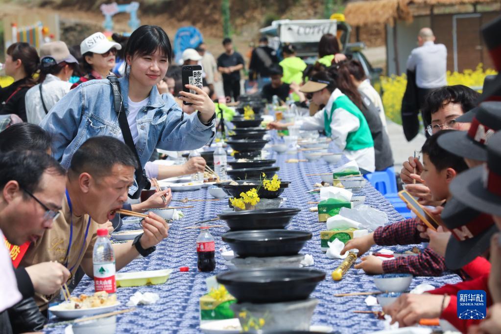 4月1日,游客在油菜花地里品嘗鄉間長(cháng)桌宴。