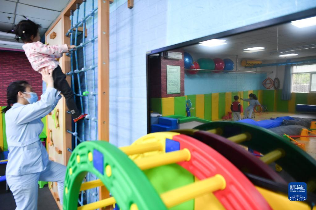 3月30日,在西安市金色陽(yáng)光康復中心,特教老師為孩子進(jìn)行康復訓練。