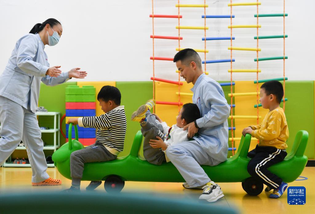 3月30日,在西安市金色陽(yáng)光康復中心,兩位特教老師(左一、右二)與孩子們一起游戲。