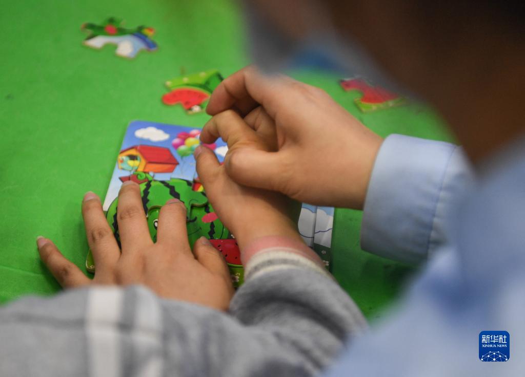 3月30日,在西安市金色陽(yáng)光康復中心,特教老師指導孩子練習拼圖。