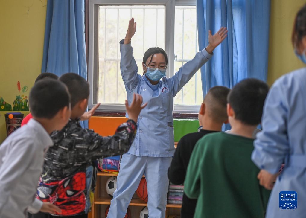 3月30日,在西安市金色陽(yáng)光康復中心,特教老師引導孩子們做體操。
