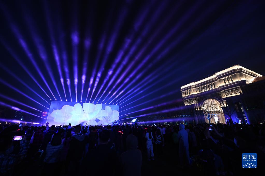 3月31日,天津市五大道風(fēng)景區的民園廣場(chǎng)內上演海棠花主題燈光秀。