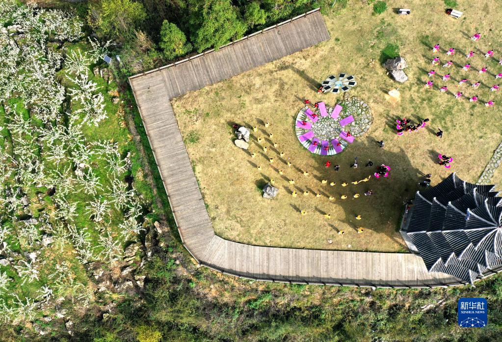 4月1日,游人在宣恩縣椒園鎮黃坪村的黃金梨園里游玩(無(wú)人機照片)。