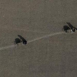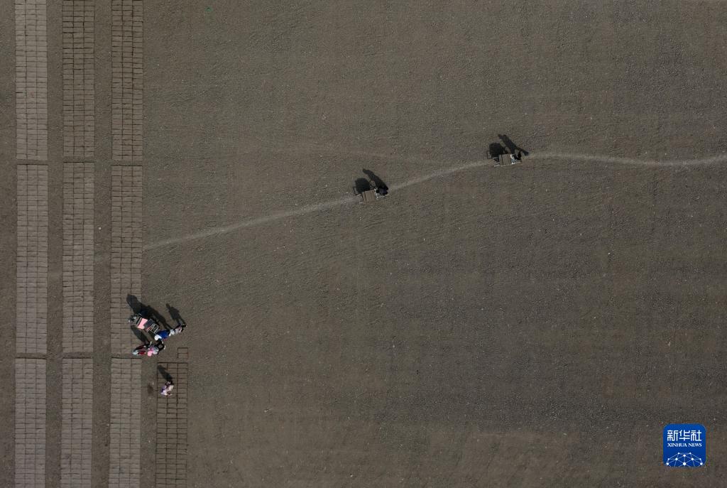 4月1日,唐山市蘆臺經(jīng)濟開(kāi)發(fā)區四社區的農民在育秧田間擺放育秧盤(pán)(無(wú)人機照片)。