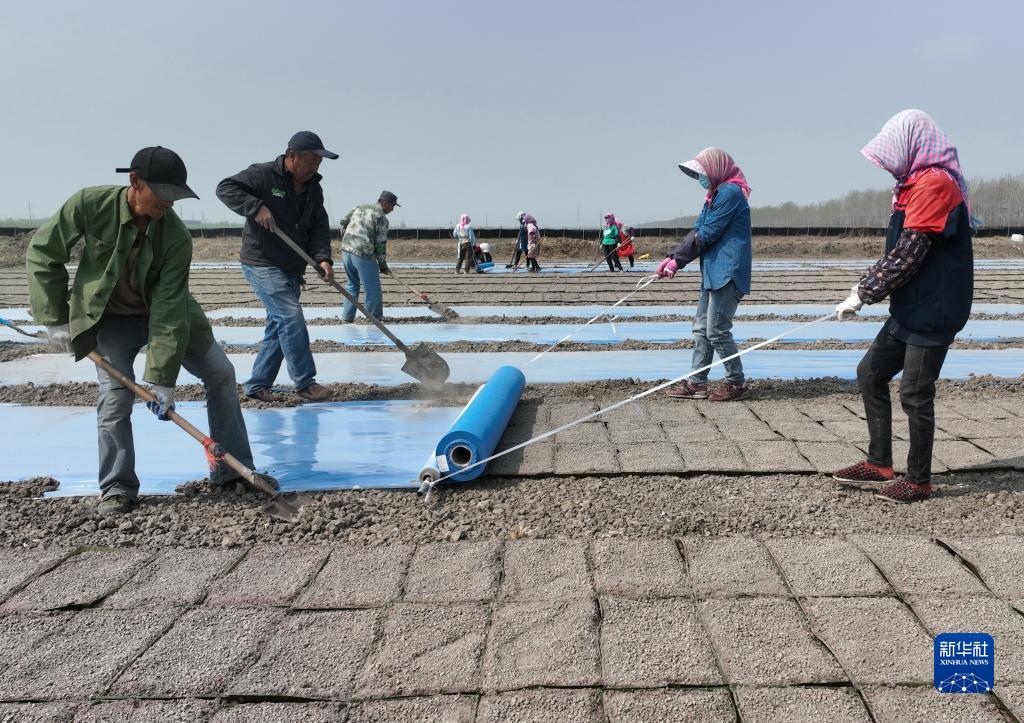 4月1日,唐山市蘆臺經(jīng)濟開(kāi)發(fā)區四社區的農民在育秧田間給擺放好的育秧盤(pán)覆膜(無(wú)人機照片)。